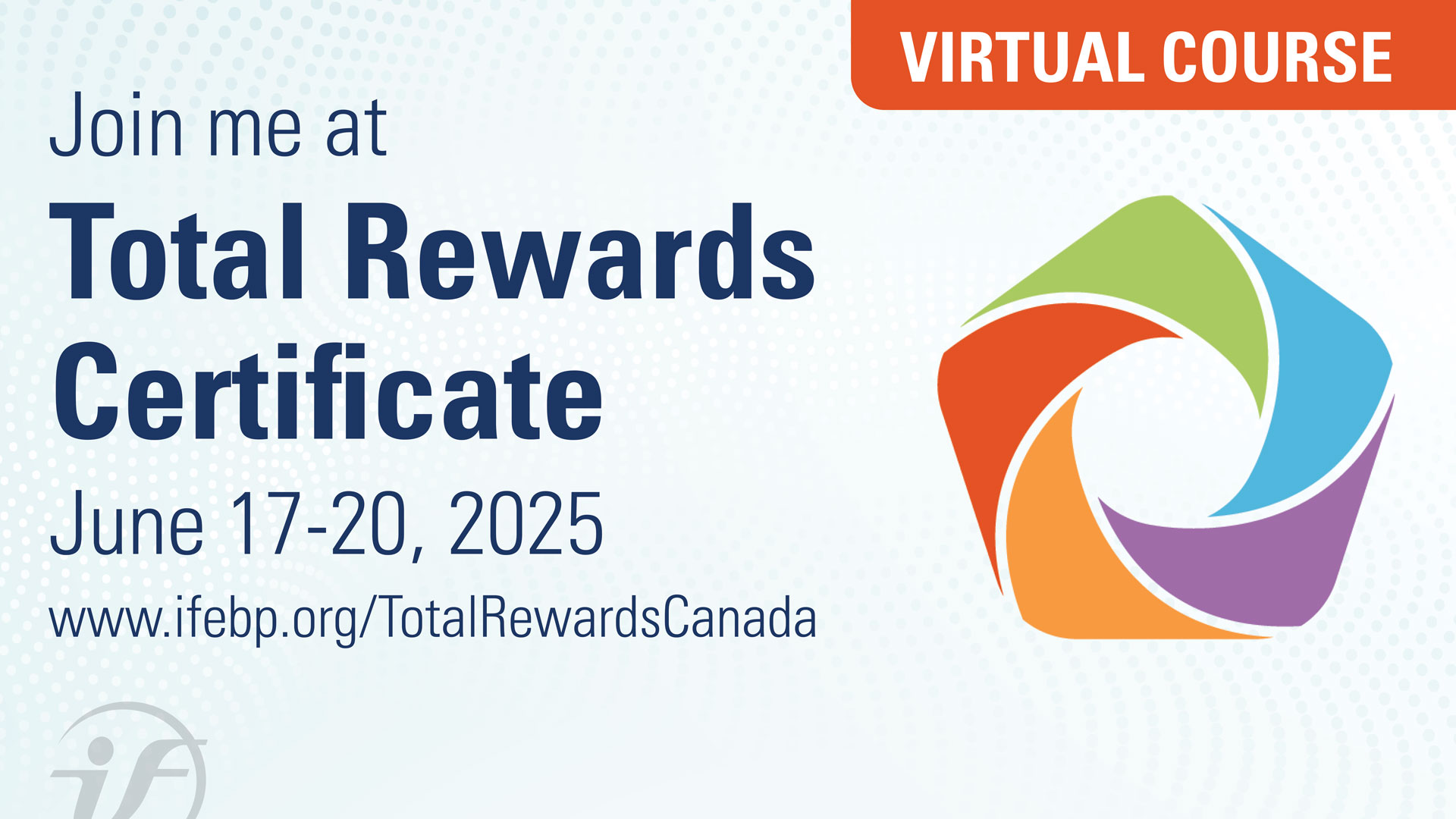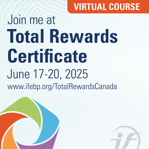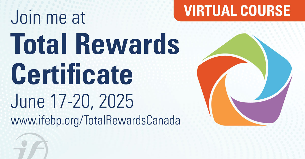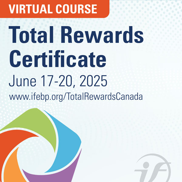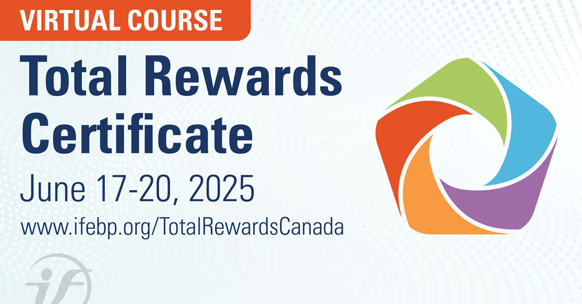 Back by Popular Demand! The Total Rewards Certificate–Virtual Course, June 17-20, 2025. Now in a new four-day format, this course provides Canadian HR, pension and benefits professionals with a holistic and employee-centric view of the total rewards landscape. Attendees will learn how to design, develop and implement an effective and sustainable total rewards strategy.  For more info, visit www.ifebp.org/TotalRewardsCanada